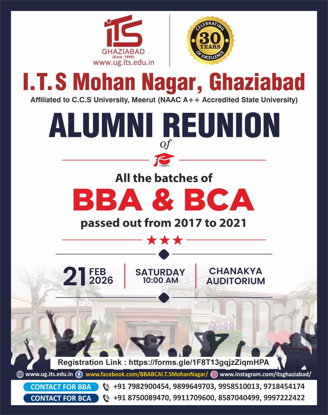 I.T.S Mohan Nagar, Ghaziabad is organizing an Alumni Reunion for all BBA & BCA batches (2017–2021 pass-outs) on 21 February 2026 (Saturday) at 10:00 AM in the Chanakya Auditorium. Alumni are invited to reconnect and relive their campus memories.