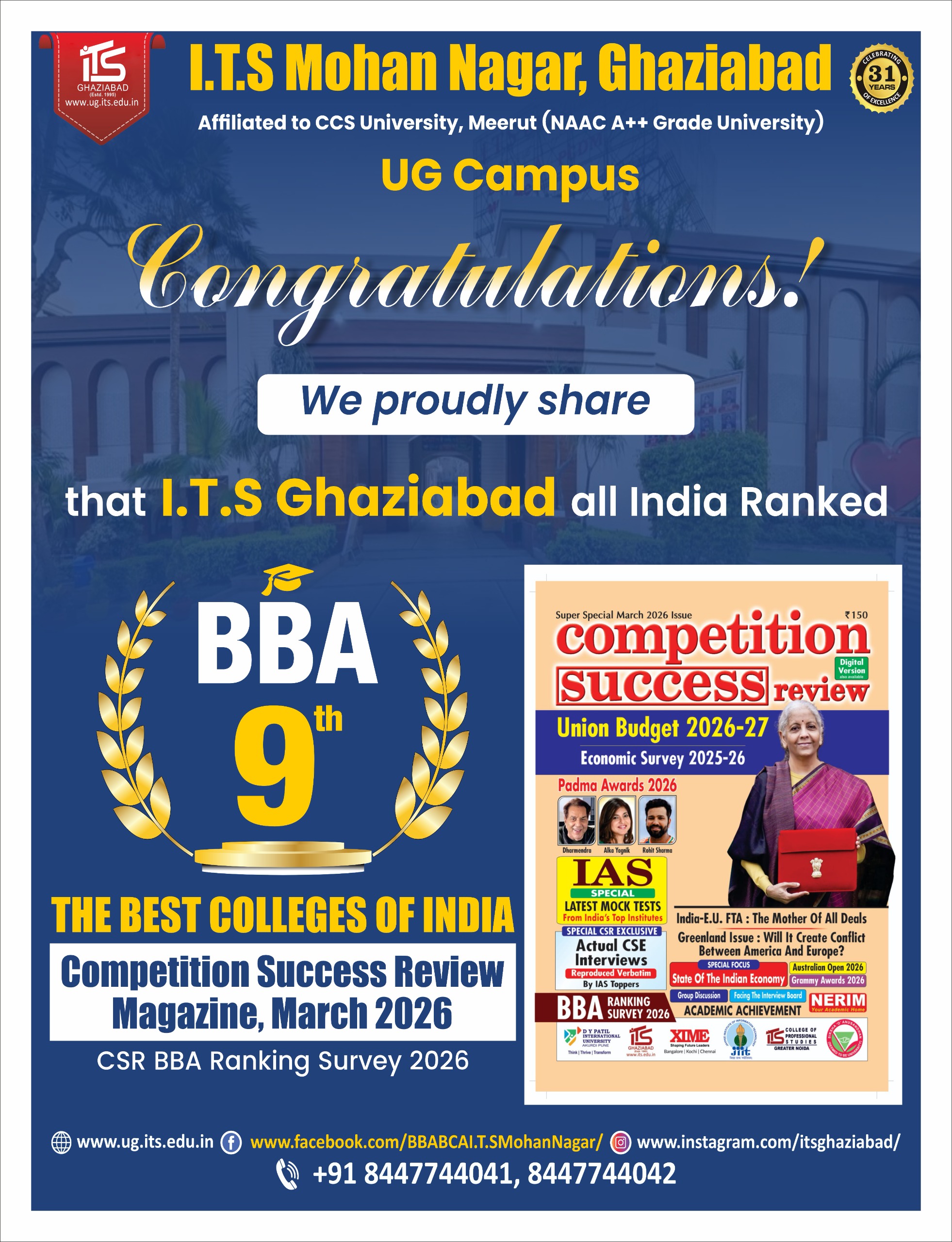 • I.T.S UG Campus (BBA & BCA) included among Leading Institute in Country by India today - MDRA best College of India Ranking - 2024