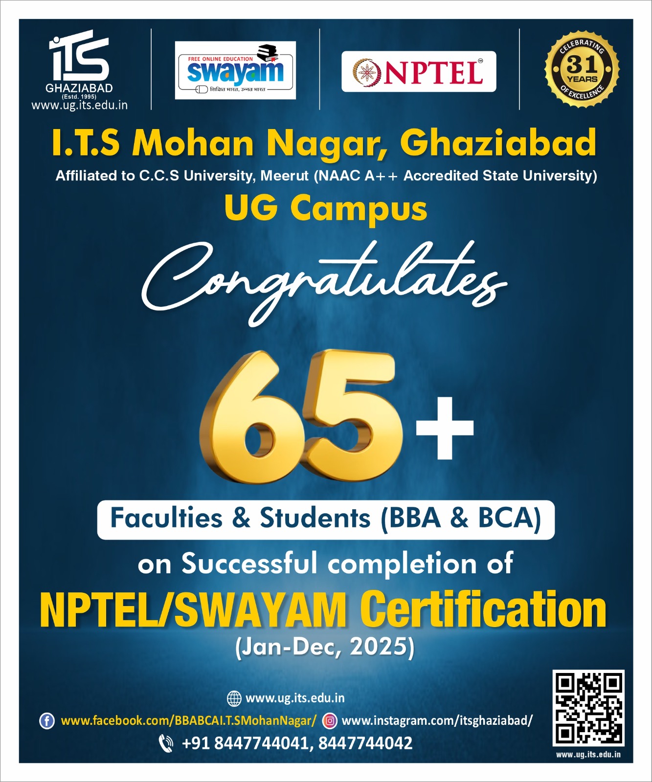 Institute of Technology & Science Ghaziabad (UG Campus), Mohan Nagar proudly congratulates its BBA & BCA faculty and students for achieving 65+ certifications through NPTEL and SWAYAM during Jan–Dec 2025.