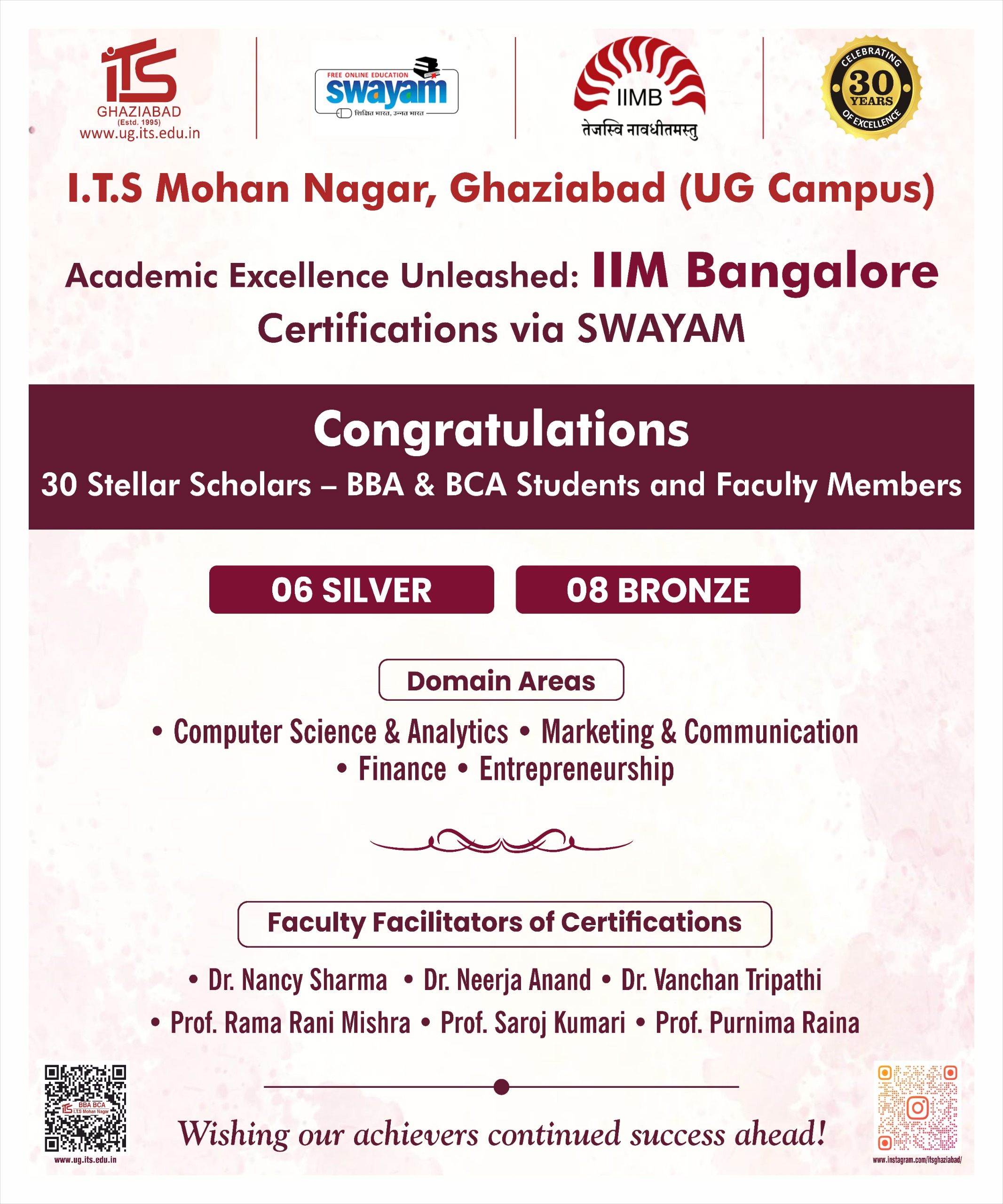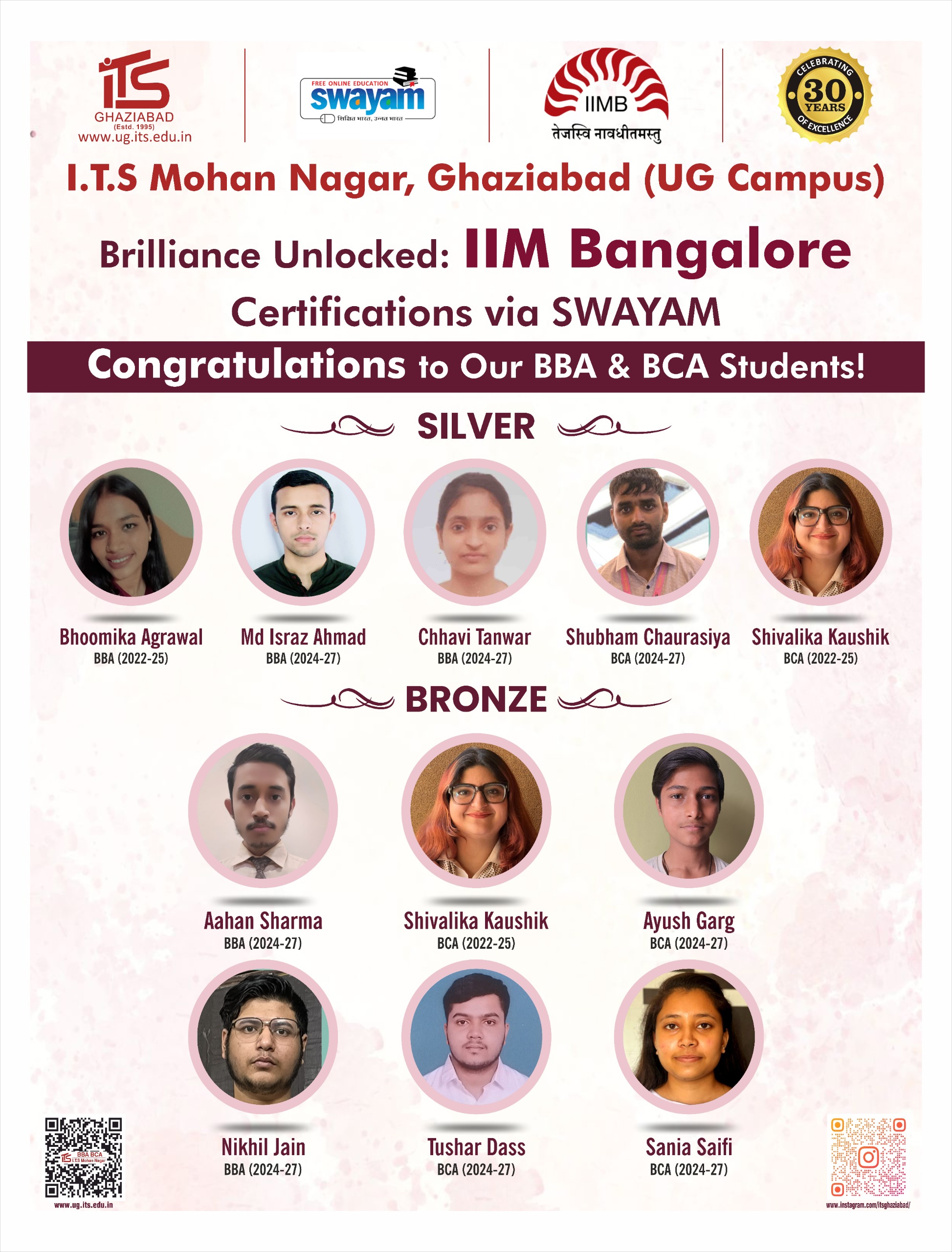 I.T.S Mohan Nagar, Ghaziabad (UG Campus) celebrates the success of 30 BBA & BCA students and faculty who earned certifications from Indian Institute of Management Bangalore through SWAYAM, securing 6 Silver and 8 Bronze across multiple domains.