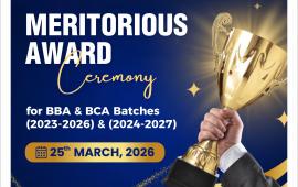 The Meritorious Award Ceremony for BBA & BCA batches (2023–2026 and 2024–2027) was held on 25th March 2026. Students with outstanding academic performance were honored and recognized for their achievements. The event aimed to motivate students and promote academic excellence.