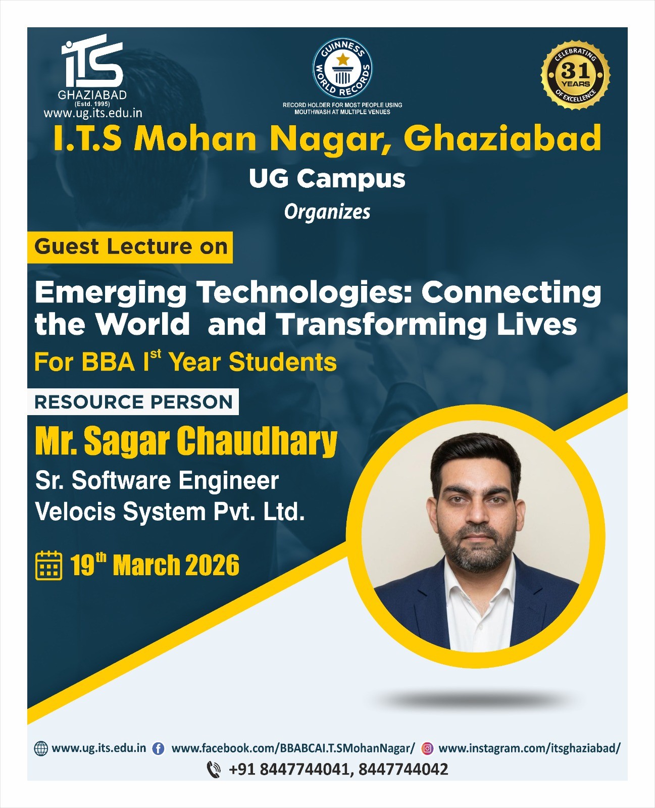 I.T.S Mohan Nagar is going to organize a guest lecture on “Emerging Technologies: Connecting the World and Transforming Lives” for BBA 1st-year students on 19th March 2026. The session will be delivered by Sagar Chaudhary, Senior Software Engineer at Velocis System Pvt. Ltd..