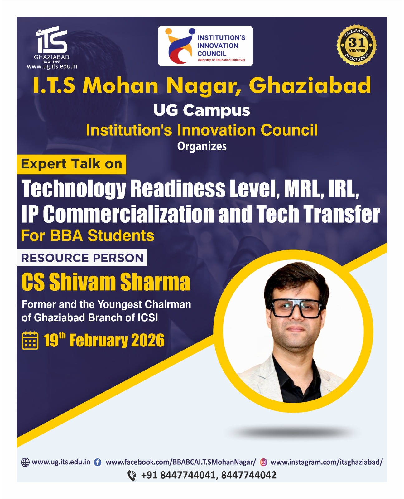 The I.T.S Mohan Nagar, Ghaziabad (UG Campus) through its Institution’s Innovation Council is organizing an Expert Talk on “Technology Readiness Level , MRL, IRL, IP Commercialization and Tech Transfer” for BBA students on 19th February 2026, featuring CS Shivam Sharma, Former and the Youngest Chairman of the ICSI Ghaziabad Branch, as the Resource Person.