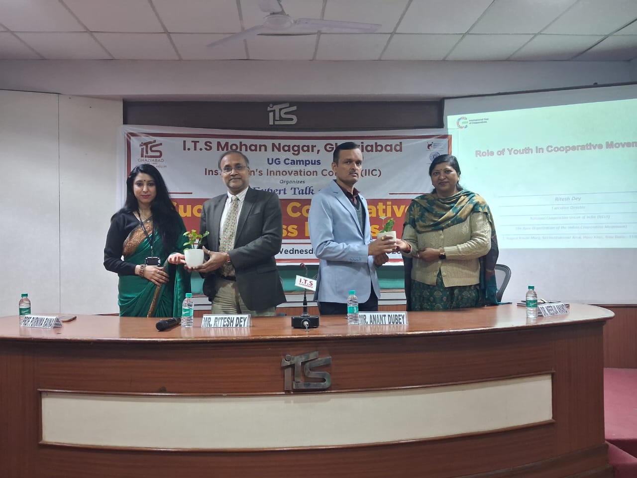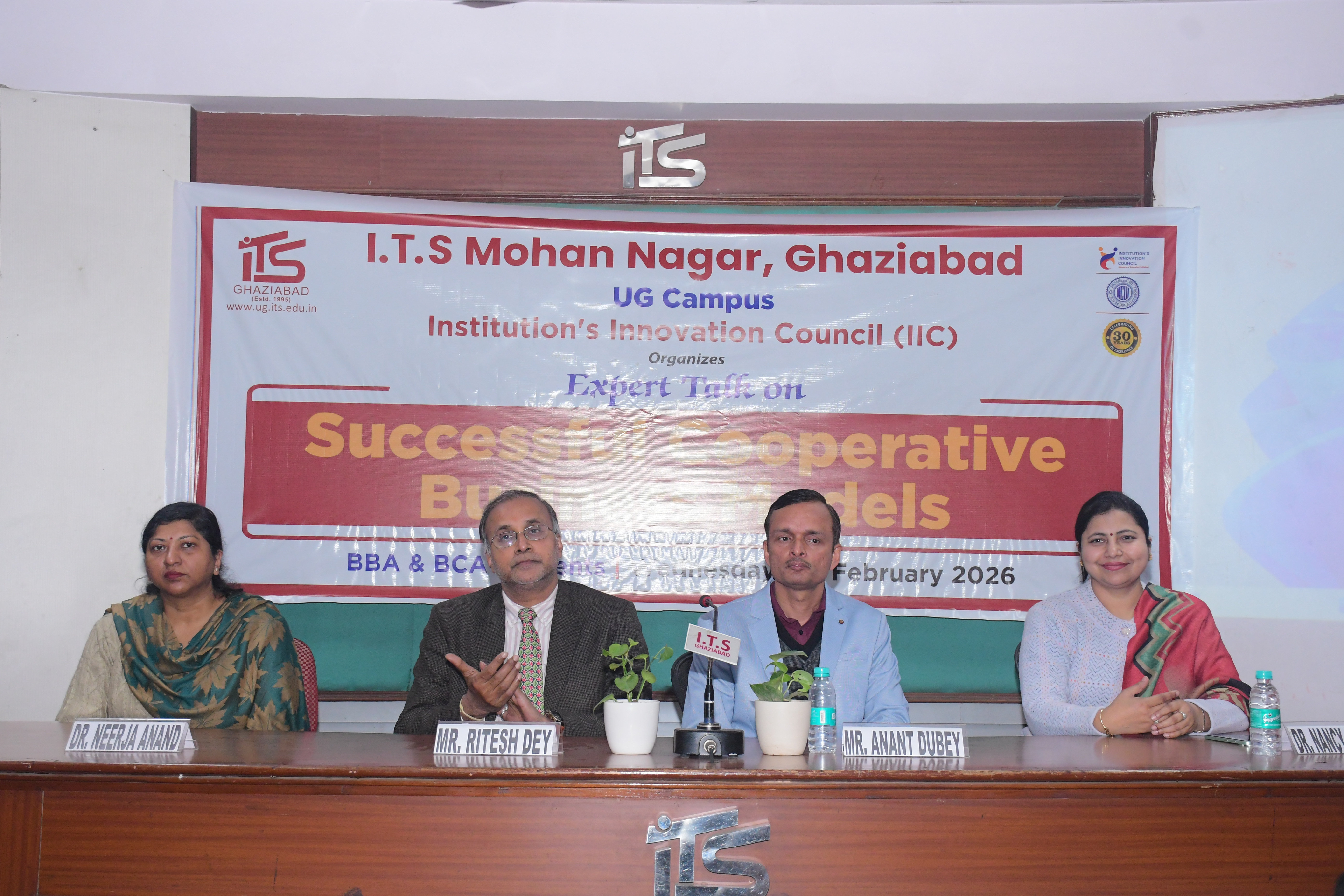Institution’s Innovation Council (IIC) cell at I.T.S Mohan Nagar (UG Campus) organized an insightful Expert Talk on “Successful Cooperative Business Models” on 11th February 2026 in collaboration with the National Cooperative Union of India (NCUI). The session was delivered by Mr. Ritesh Dey, Executive Director, NCUI, and Mr. Anant Dubey, Deputy Director, NCUI. The event was coordinated by Dr. Neerja Anand and Prof. Purnima Raina. The program commenced with the felicitation of the distinguished guests, setting a respectful and enthusiastic tone for the session. During the session, the experts elaborated on the concept of cooperative societies as sustainable and inclusive business models. They explained how cooperative enterprises convert skills into ideas and ideas into collective benefits, ensuring shared growth and democratic participation. The speakers highlighted: The process of forming and registering cooperative societies The role of NCUI as the apex body supporting cooperatives across states The importance of structured governance and objective-driven member participation Examples of successful cooperatives, including long-standing cooperative models in states like Gujarat Employment generation and equitable distribution of responsibilities in the initial stages of cooperative formation The speakers emphasized that cooperative models empower communities by pooling resources, skills, and funds to achieve common economic and social objectives. They also discussed how youth can actively participate in forming innovative cooperatives in emerging sectors. Dr. Nancy Sharma, Principal, I.T.S Mohan Nagar UG Campus, also addressed the gathering and enlightened students about the importance of cooperatives in nation-building and economic empowerment. She explained that cooperatives not only promote entrepreneurship and self-reliance but also create employment opportunities, encourage ethical business practices, and ensure inclusive growth. She motivated students to explore cooperative ventures as a viable career and business option that aligns profit with social responsibility. The session concluded with an engaging interaction round, where students actively participated and clarified their queries regarding cooperative registration, governance, and funding mechanisms. The event ended on a note of gratitude as Dr. Nancy Sharma honored the esteemed speakers with a Plaque of Honor, appreciating their valuable insights and contribution. The expert talk proved to be highly informative and inspiring, equipping students with practical knowledge about cooperative business models and their transformative potential in today’s economy.
