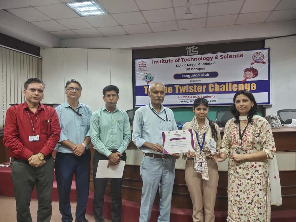 Description: Mastering the individual sounds in words is a critical skill for reading success. With this objective, Language Club of I.T.S, UG Campus organized a “Tongue Twister Challenge” for the students of BBA & BCA on September 30, 2025. The students were given different tongue twisting words, slogans and sentences to repeat. All the students participated with full enthusiasm and zeal. It was full of fun, laughter, and a bit of wordplay. The students enjoyed and were happy after the tongue tangling exercise. Following students were declared winners on the basis of different parameters: 1st Prize Mohd Junaid BBA- 3rd Sem 2nd Prize Aarzoo Khan BBA- 1st Sem 3rd Prize Anshika Jain BBA- 5th Sem