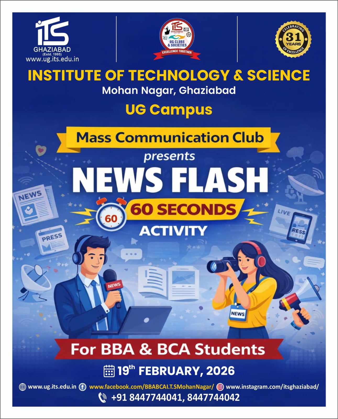 The Mass Communication Club of UG Campus, I.T.S Mohan Nagar, Ghaziabad is organizing a “News Flash – 60 Seconds Activity” for BBA & BCA students on 19th February 2026.