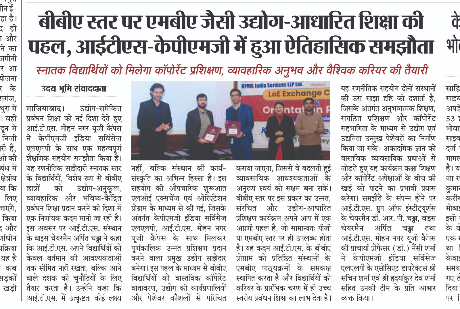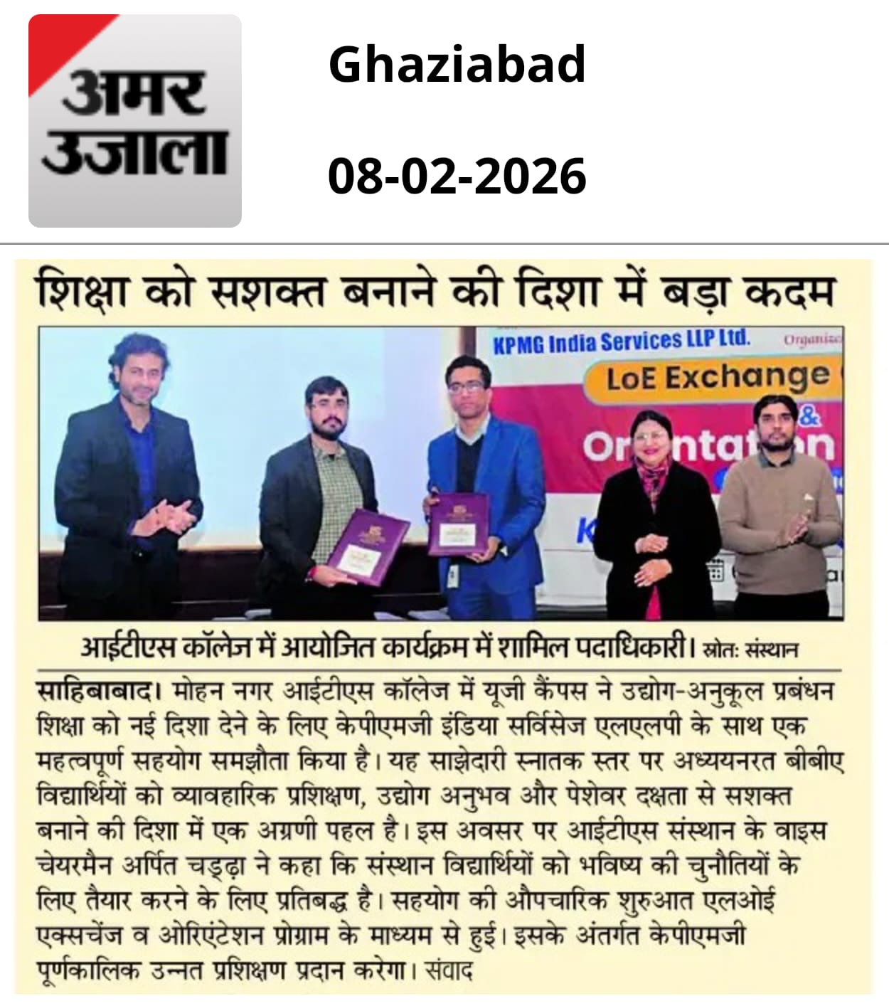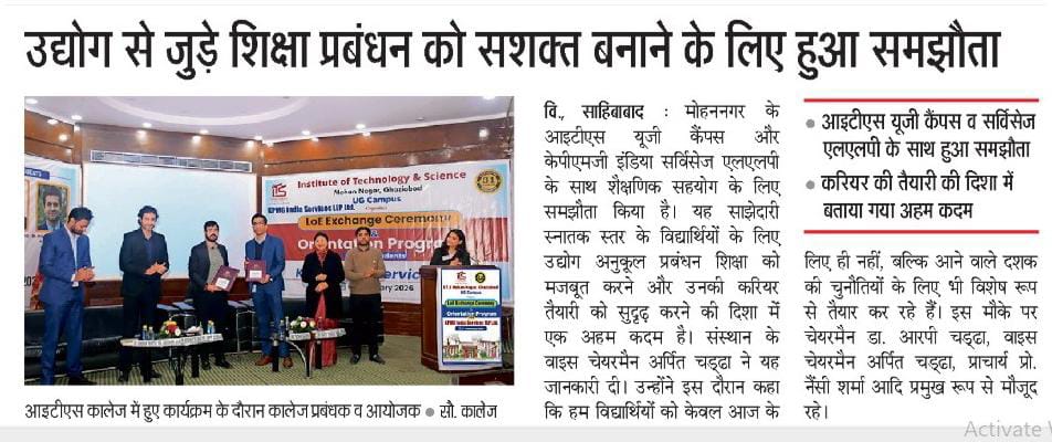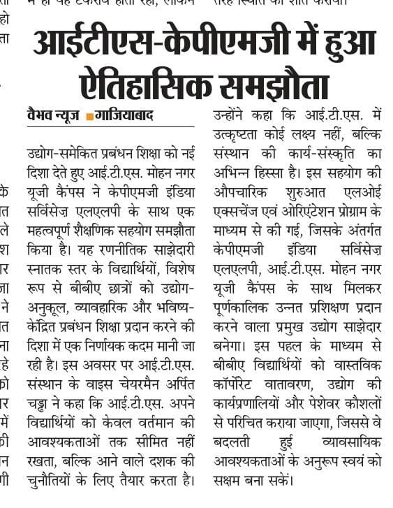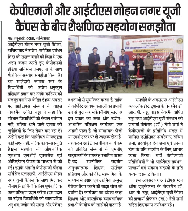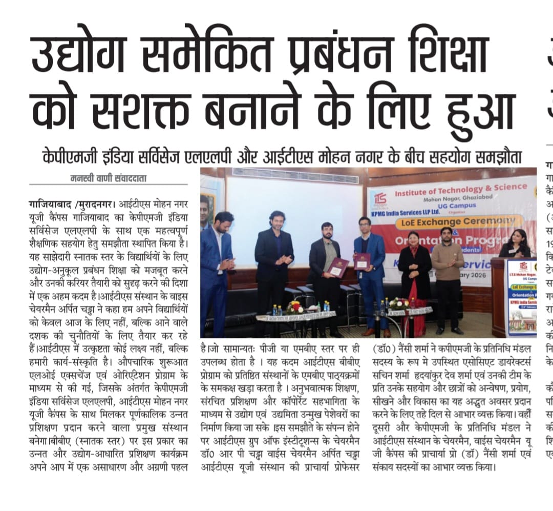 Setting a new benchmark in higher education, I.T.S Mohan Nagar, Ghaziabad (UG Campus) announces a landmark collaboration with KPMG India Services LLP through the LoE Exchange Ceremony & Orientation Program, ushering in a powerful academia–industry partnership designed to deliver industry-integrated training and create truly future-ready BBA professionals.