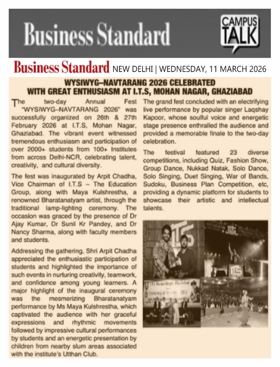 The two-day fest WYSIWYG–Navtarang 2026 was held on 26–27 February 2026 with participation from 2000+ students of 100+ institutes across Delhi-NCR. The event was inaugurated by Arpit Chadha, the Vice Chairman of I.T.S – The Education Group, along with renowned Bharatanatyam dancer Maya Kulshreshtha.